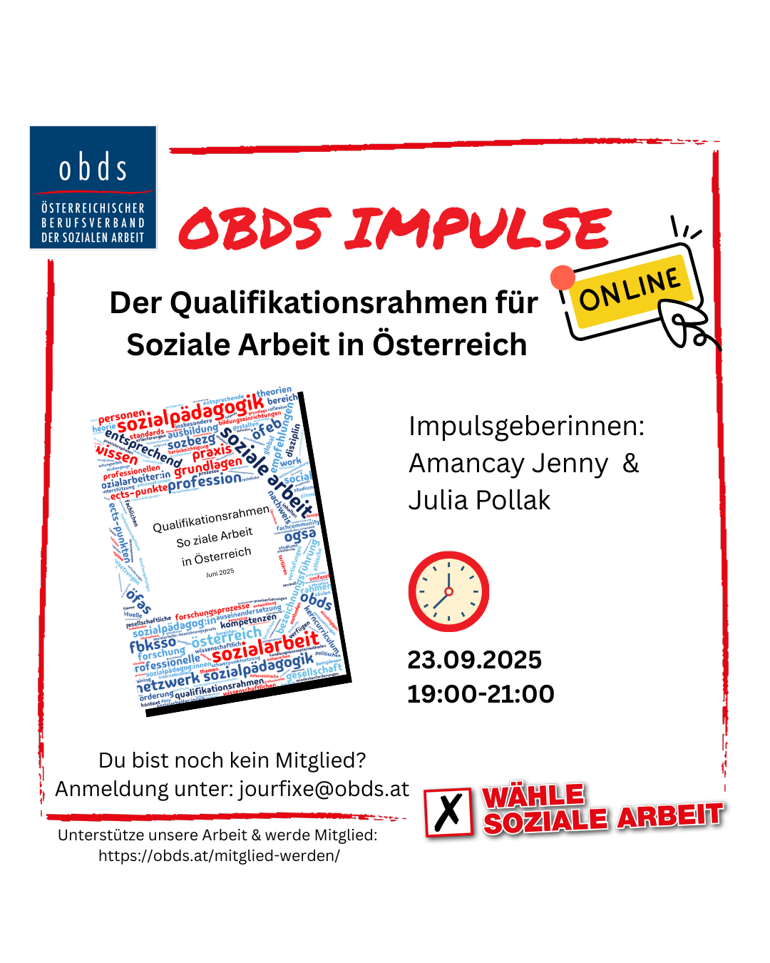 Alle Beiträge 19. September 2025 Recap & Ausblick: obds Impulse 2024/25 2. September 2025 obds Events im September! 🎉* 26. Juni 2025 Der Qualifikationsrahmen für Soziale Arbeit in Österreich 25. Juni 2025 Berufsgesetz für die Soziale Arbeit – für ein Ende der unendlichen Geschichte! 17. Juni 2025 Im Gespräch über ein Berufsgesetz für die Soziale Arbeit 11. Juni 2025 Stellungnahme: Warum ein Berufsgesetz für Soziale Arbeit in Zeiten des Arbeitskräftemangels notwendig ist! 10. Juni 2025 Öffentliche Stellungnahme zur Situation und Zukunft der Kinder- und Jugendhilfe in Österreich 4. Juni 2025 Stellungnahme des obds zum geplanten Verbot von geringfügiger Beschäftigung bei Bezug von Leistungen des AMS 1. Juni 2025 obds Events Juni 26. Mai 2025 Berufsgesetz jetzt – save the date 22. Mai 2025 Wir suchen Dich für neue Impulse 12. Mai 2025 obds Quo Vadis? 29. April 2025 obds Events im Mai! 17. April 2025 Für eine starke Kinder- und Jugendhilfe: Jetzt offene Stellungnahme unterzeichnen! 10. April 2025 Grenzgänge – Soziale Arbeit zwischen forensisch-therapeutischen Einrichtungen & Erlebnispädagogik? 123 Weiter