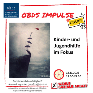 Am 18.11.2025 hat im Rahmen der Veranstaltungsreihe „obds Impulse“ ein offener Austausch mit über 40 Kolleg*innen aus ganz Österreich stattgefunden. Im Mittelpunkt der Diskussion stand die Frage „Was braucht eine zeitgemäße wertschätzende Kinder- und Jugendhilfe?“