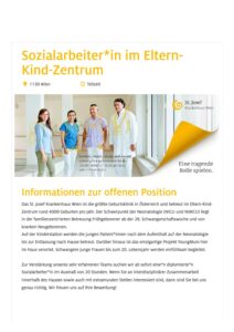 Zur Verstärkung unseres sehr erfahrenen Teams suchen wir ab sofort eine*n diplomierte*n Sozialarbeiter*in im Ausmaß von 20 Stunden. Wenn Sie an interdisziplinärer Zusammenarbeit innerhalb des Hauses sowie auch mit extramuralen Stellen interessiert sind, dann sind Sie bei uns genau richtig. Wir freuen uns auf Ihre Bewerbung!