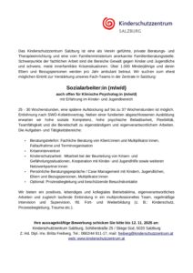 Das Kinderschutzzentrum Salzburg ist eine als Verein geführte, private Beratungs- und Therapieeinrichtung und eine vom Familienministerium anerkannte Familienberatungsstelle. Schwerpunkte der fachlichen Arbeit sind die Bereiche Gewalt gegen Kinder und Jugendliche und schwere, meist innerfamiliäre Krisensituationen. Über 1.000 Minderjährige und deren Eltern und Bezugspersonen werden pro Jahr ambulant betreut. Wir suchen zum ehest möglichen Eintritt zur Verstärkung unseres Fach-Teams in der Zentrale in Salzburg: