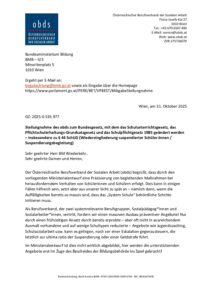 Stellungnahme des obds zum Bundesgesetz, mit dem das Schulunterrichtsgesetz, das Pflichtschulerhaltungs-Grundsatzgesetz und das Schulpflichtgesetz 1985 geändert werden – insbesondere zu § 44 SchUG (Wiedereingliederung suspendierter Schüler:innen / Suspendierungsbegleitung)
