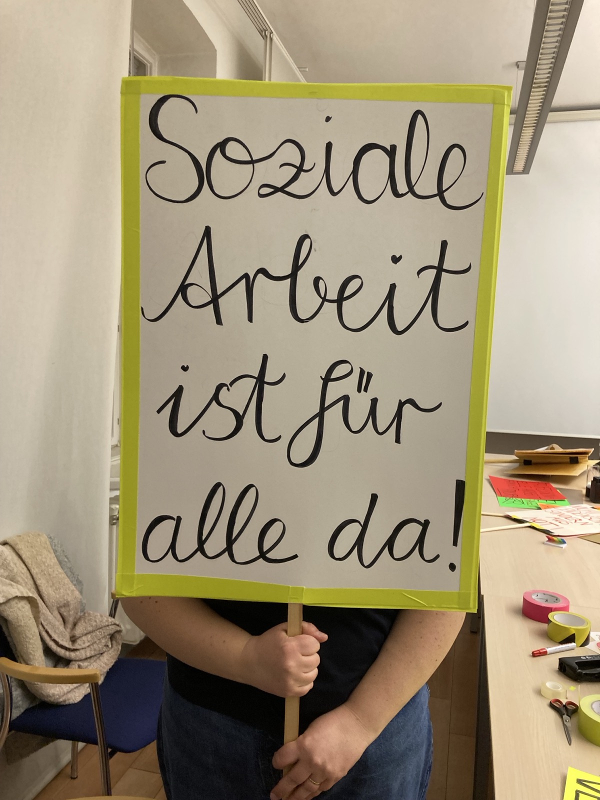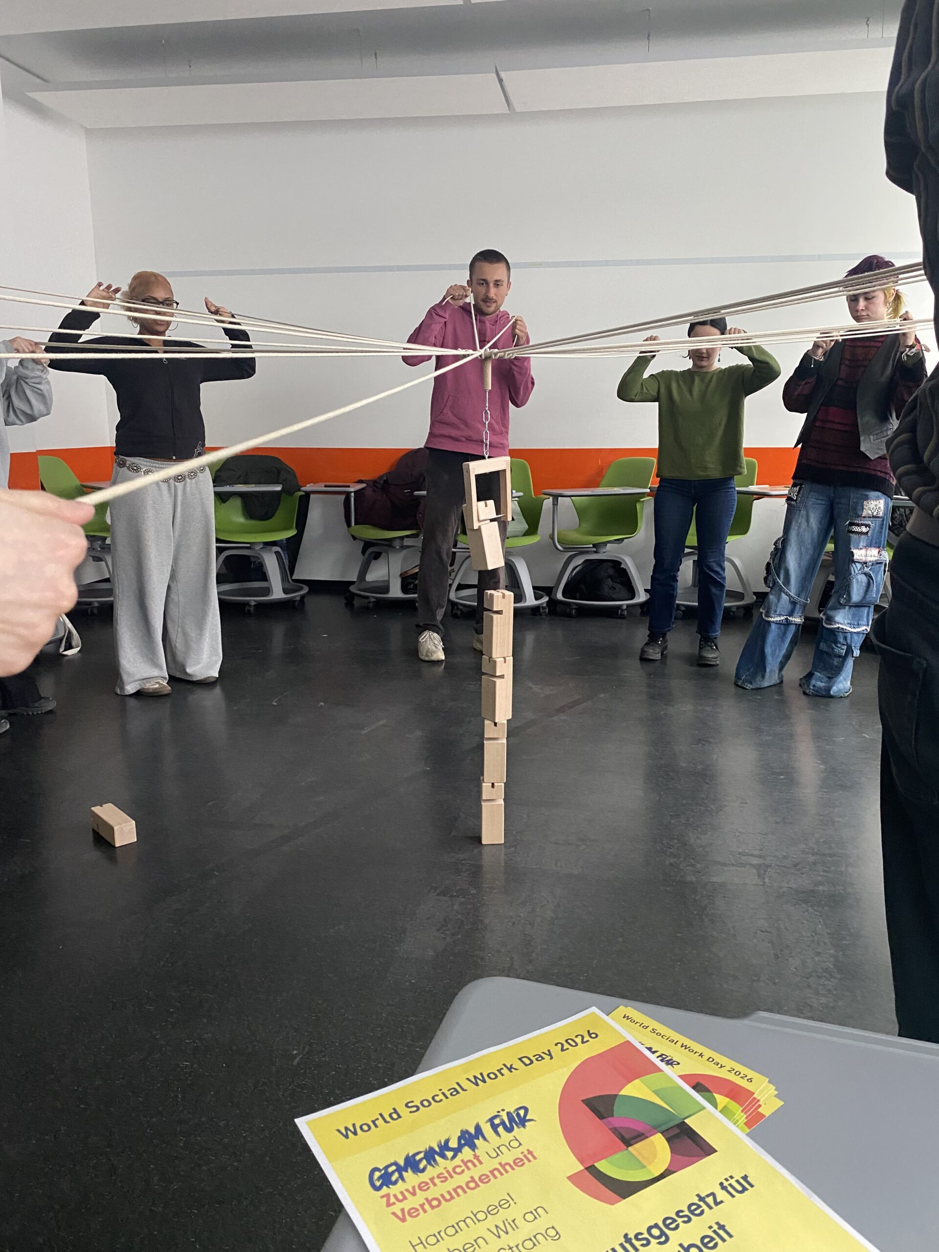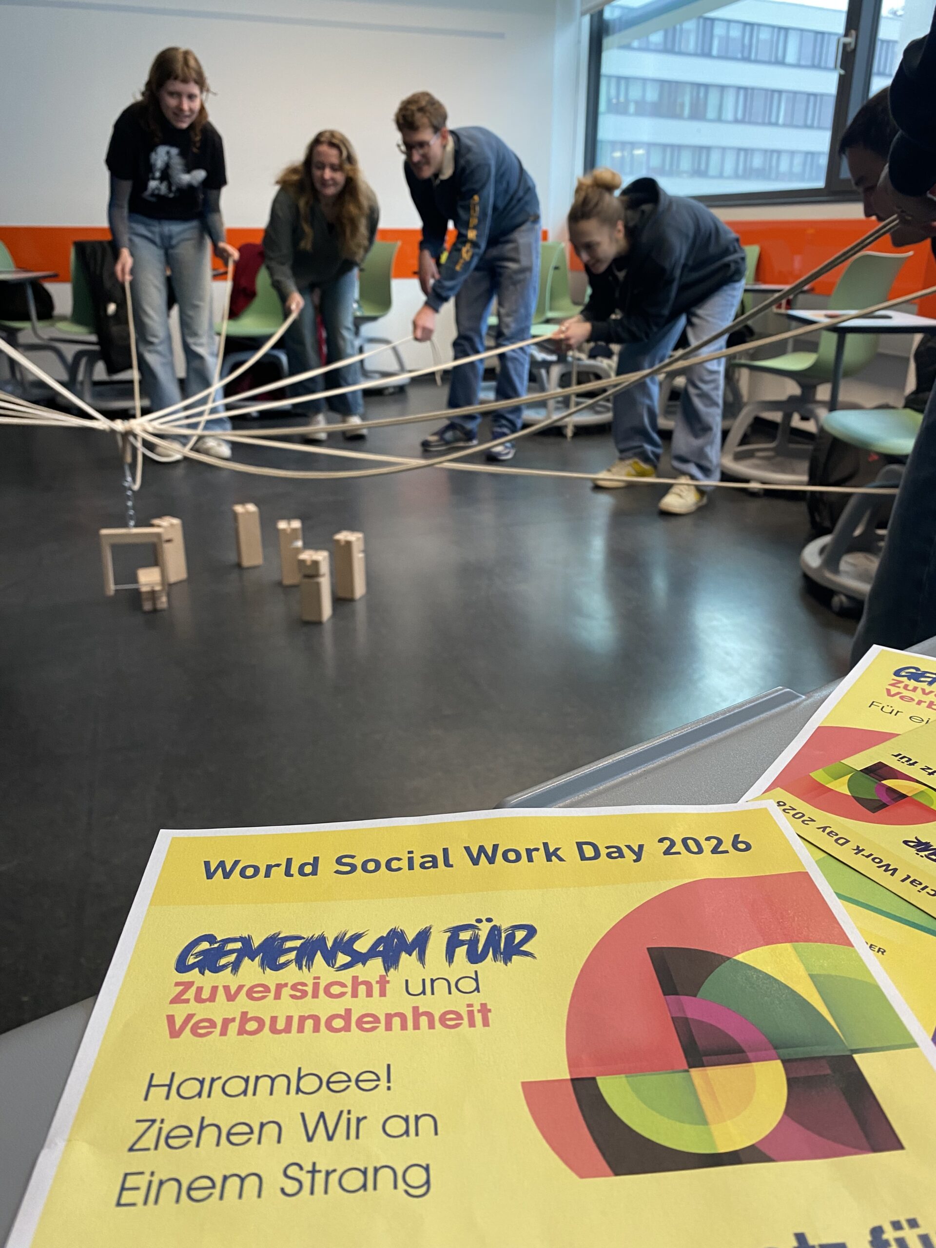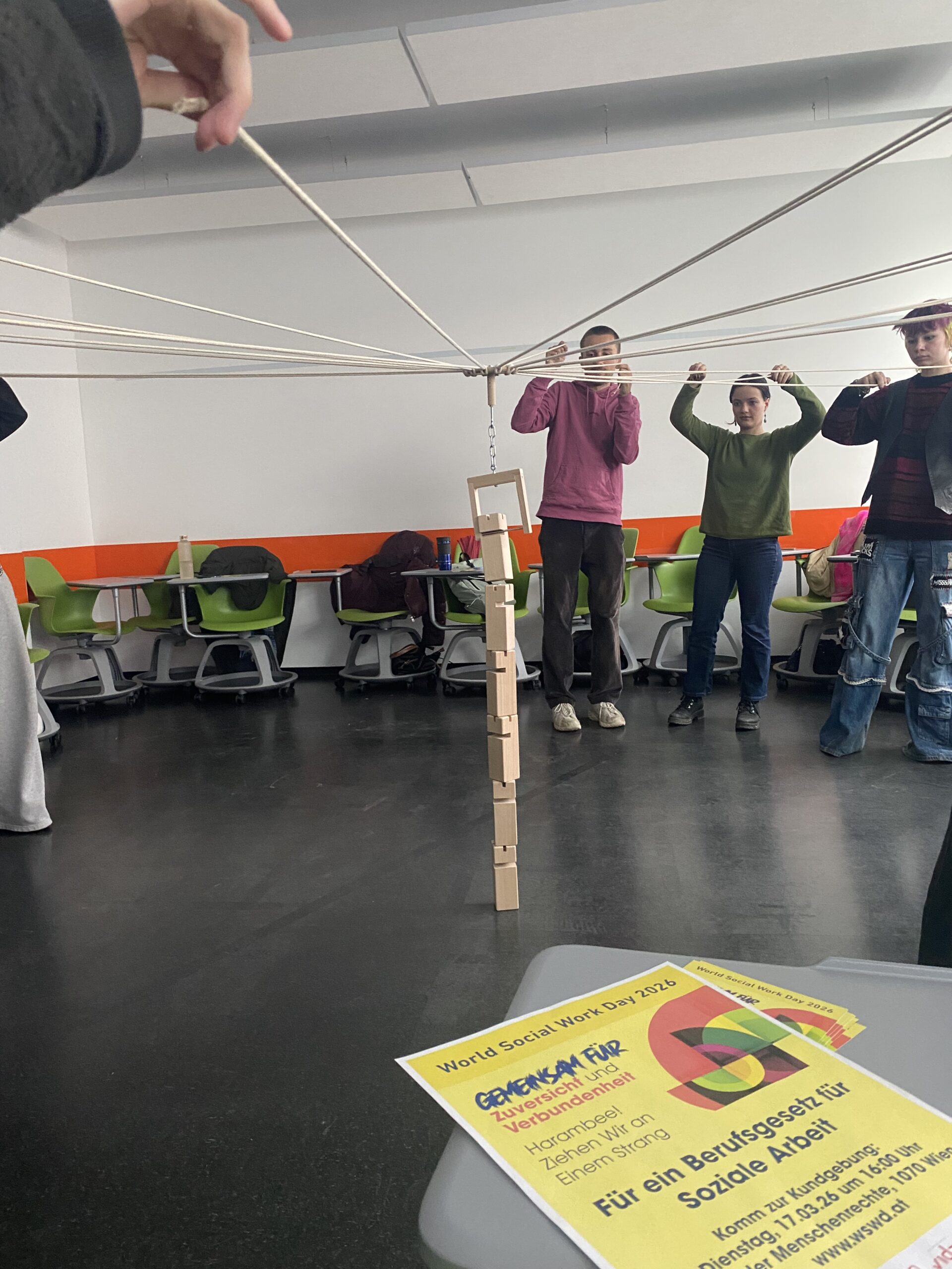 - Schnappt euch ein Seil oder Tuch oder haltet das WSWD Plakat gemeinsam um aufzuzeigen, wie wichtig das Ziehen an einem Strang für ein Berufsgesetz für Soziale Arbeit ist.